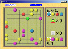 *作品の内容貴方とコンピュータが交互に色石を置いて行き、 置いた色で他の色を挟むと自分の陣地になります。 陣地が多いほうが勝ちです。 *操作方法 タイトルでウィンドウの何処かをクリックで始まります。 上のメニューで「始めから」「終わり」を選べます。 左クリックで色石を置くことが出来ます。 |
