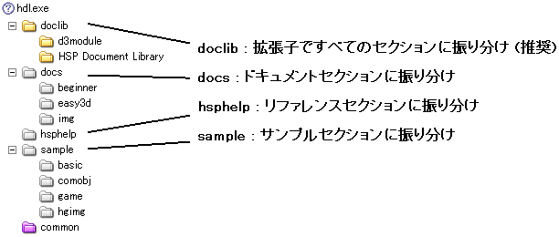 プラグインやモジュールごとに、doclib ディレクトリ下にカテゴリ ディレクトリを作成し、 その中に関連ドキュメント (hs, hsp サンプル, txt, HTML 文書やそれで使われる画像、スタイルシートなど) をまとめると、 ファイル数が多くなっても管理しやすくなります。